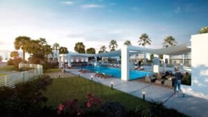 - Communal pool deck — a central gathering point for residents, with sun terraces and shade structures for year-round usability